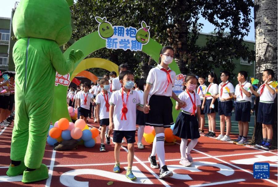 9月1日,在北京市海淀區(qū)太平路小學,六年級學生帶領(lǐng)一年級新生走入開學典禮現(xiàn)場。