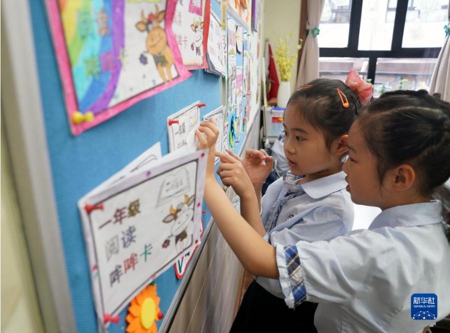 9月1日,上海市黃浦區(qū)盧灣二中心小學的教室內(nèi),學生們在翻看同學暑假里的閱讀書目和筆記。