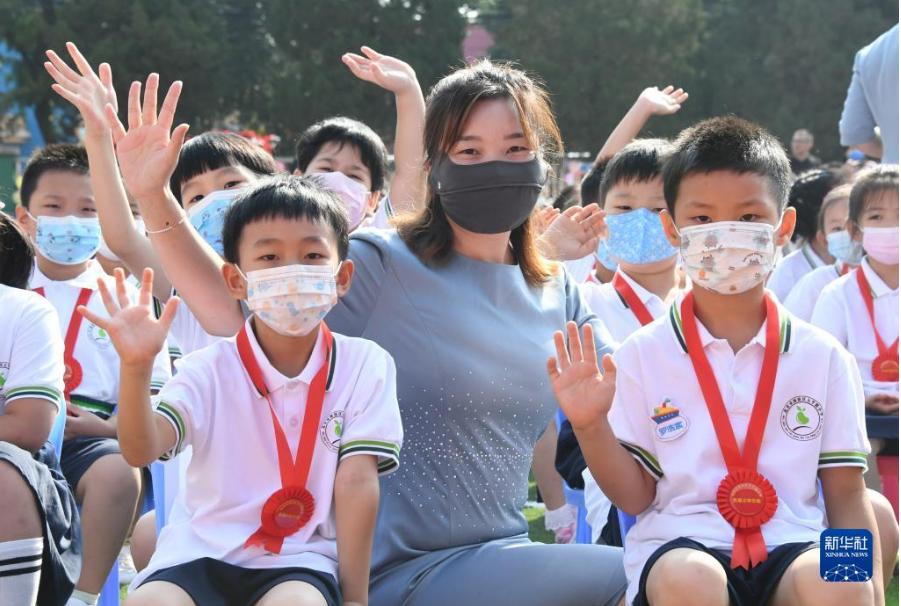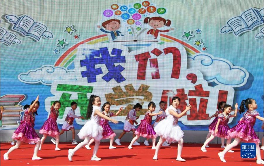 9月1日,在北京市海淀區(qū)太平路小學,學生在開學典禮中表演節(jié)目。