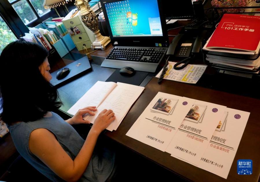 這是9月1日在上海市黃浦區(qū)盧灣二中心小學教師辦公室內(nèi)拍攝的新學期作業(yè)管理要求和制度。這是學校根據(jù)“雙減”政策及相關(guān)規(guī)定重新修訂的,要求老師嚴格執(zhí)行。