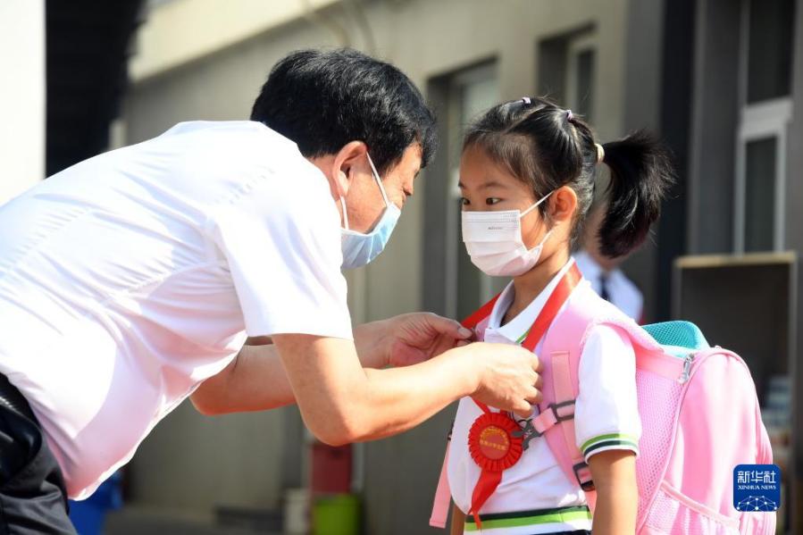 9月1日,在北京市海淀區(qū)太平路小學,老師為一年級新生佩戴“小紅花”。