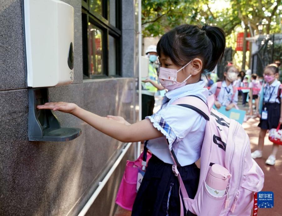 9月1日,上海市黃浦區(qū)盧灣二中心小學的學生入校后進行手部消毒。