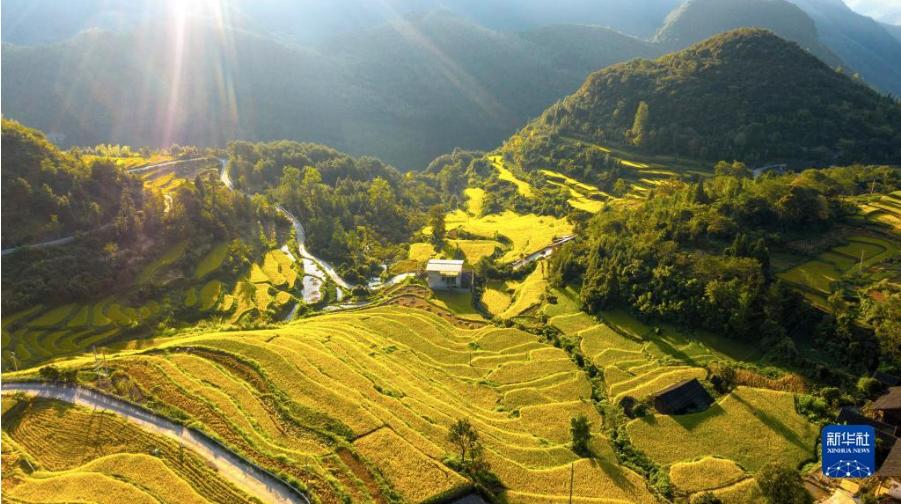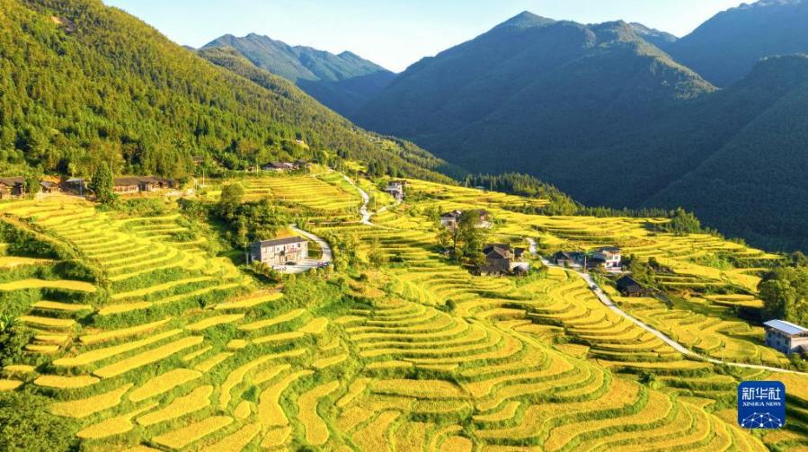 眼下,湖南省東安縣山村梯田豐收在望,金黃色的梯田層層疊疊,美不勝收。
