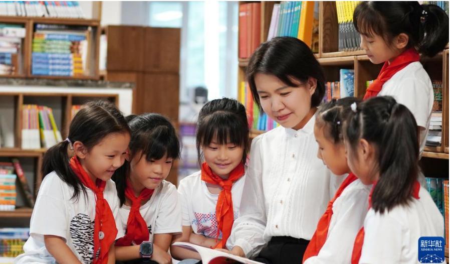 9月7日,沈陽市渾南區(qū)第九小學(xué)教師陳秋穎陪伴學(xué)生閱讀。新華社發(fā)
