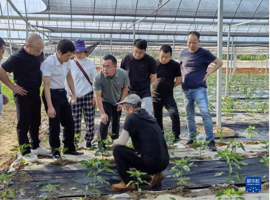 技術(shù)專家在湖南省汨羅市白塘鎮(zhèn)的育秧大棚給辣椒種植戶指導(dǎo)種植技術(shù)(9月13日攝)。
