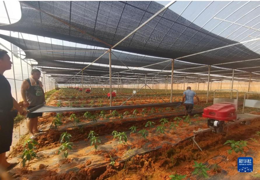 湖南省汨羅市白塘鎮(zhèn)的辣椒種植戶在大棚鋪設(shè)地膜(9月13日攝)。