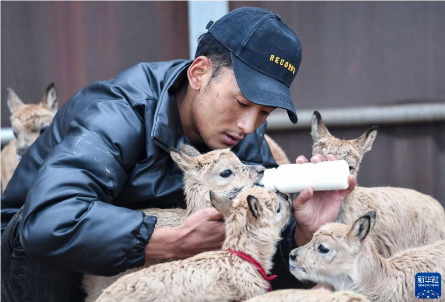 可可西里國(guó)家級(jí)自然保護(hù)區(qū)卓乃湖保護(hù)站的工作人員才文多杰在給藏羚羊幼仔喂奶(2020年7月7日攝)。