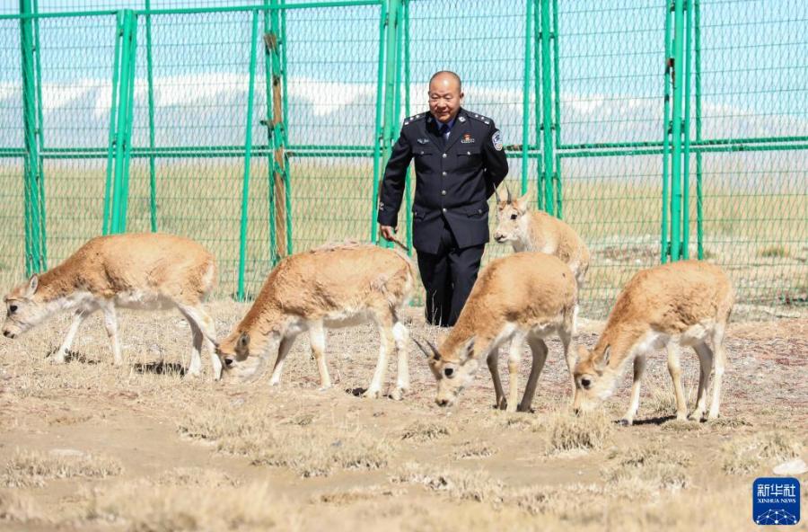 在可可西里國(guó)家級(jí)自然保護(hù)區(qū)索南達(dá)杰保護(hù)站,站長(zhǎng)趙新錄與藏羚羊在一起(9月28日攝)。