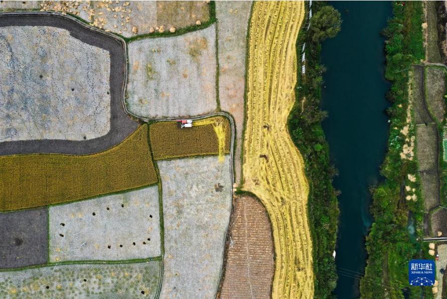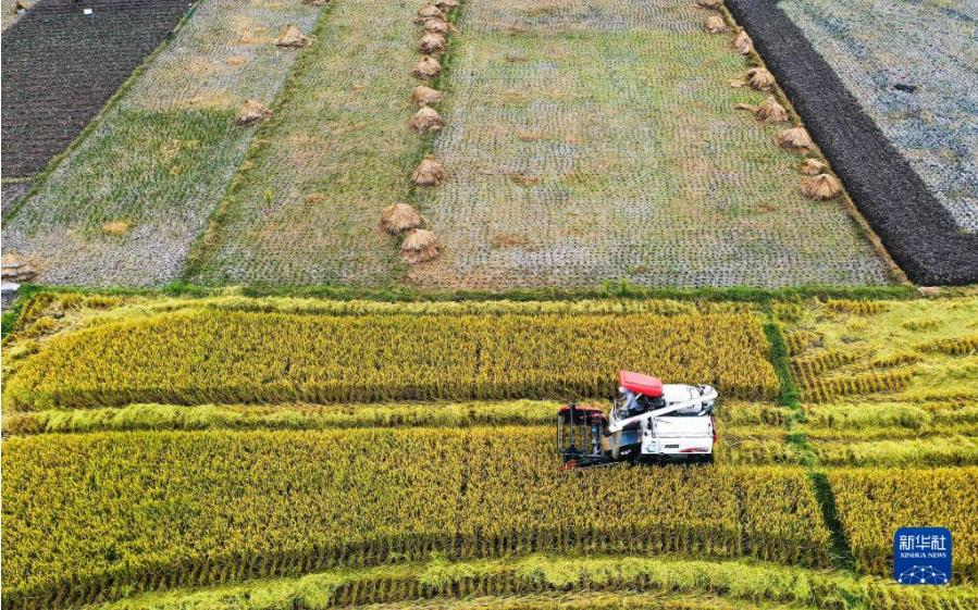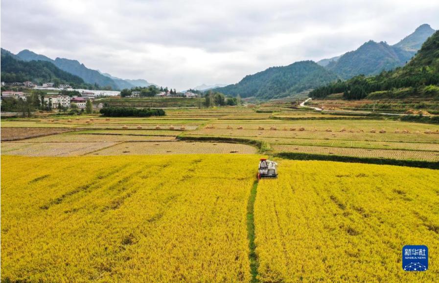 10月8日,農(nóng)民駕駛收割機(jī)在麻江縣壩芒鄉(xiāng)樂(lè)坪村搶收水稻(無(wú)人機(jī)照片)。