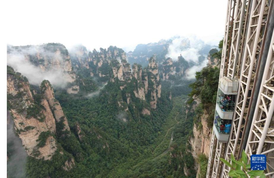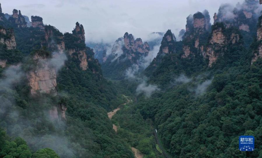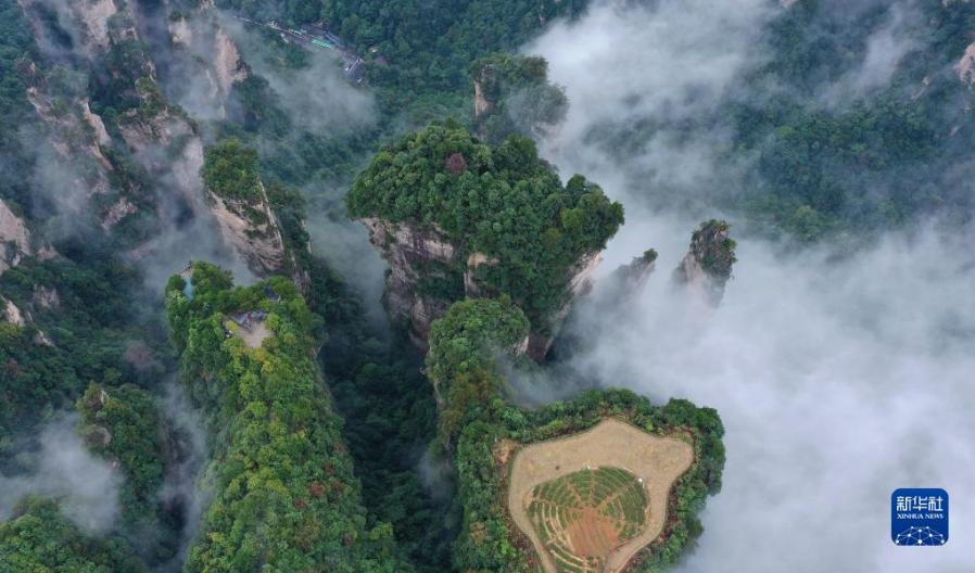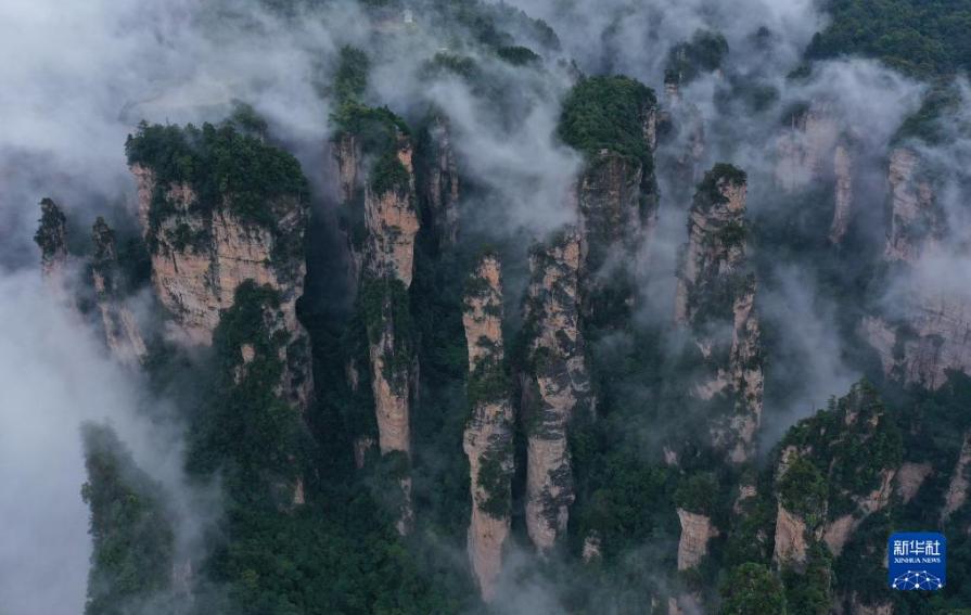 當(dāng)日,雨后的湖南張家界武陵源,云霧飄蕩在峰林之間,若隱若現(xiàn),美不勝收(無(wú)人機(jī)照片)。新華社發(fā)(吳勇兵 攝)