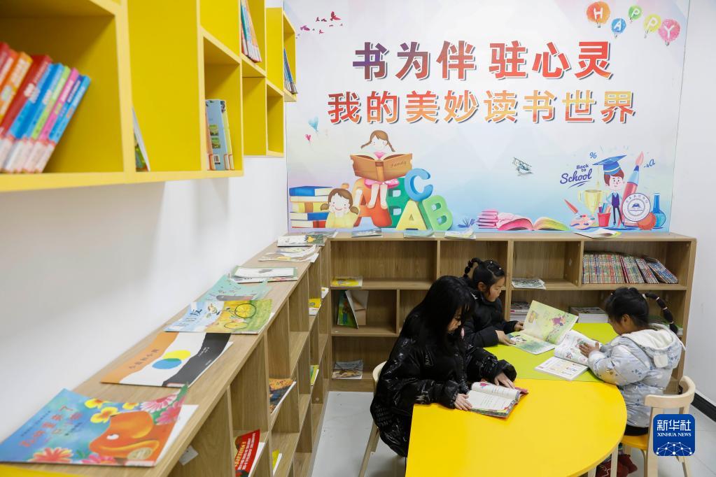 2月8日,小朋友們?cè)趶埌藰蜴?zhèn)圖書館閱讀。