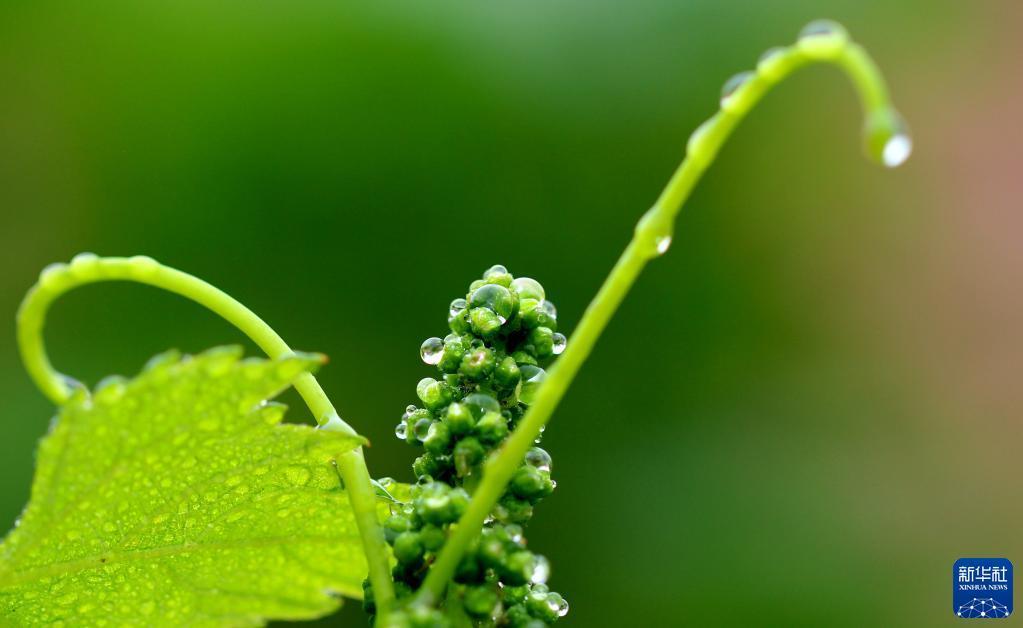4月25日,在山東省鄒平市南部山區(qū),葡萄花序掛滿雨露。