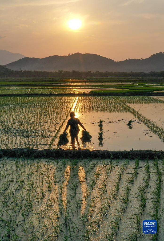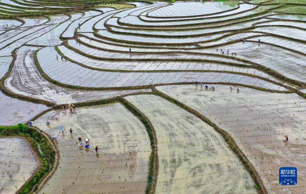 5月10日,農(nóng)民在重慶市酉陽土家族苗族自治縣涂市鎮(zhèn)大杉村稻田中勞作(無人機(jī)照片)。