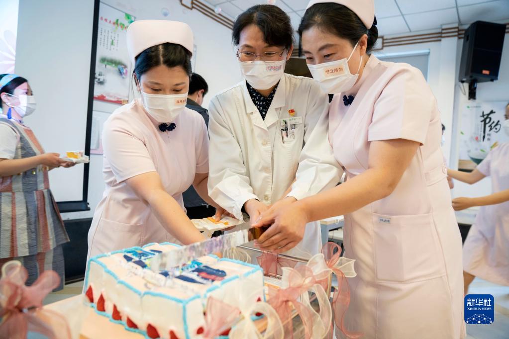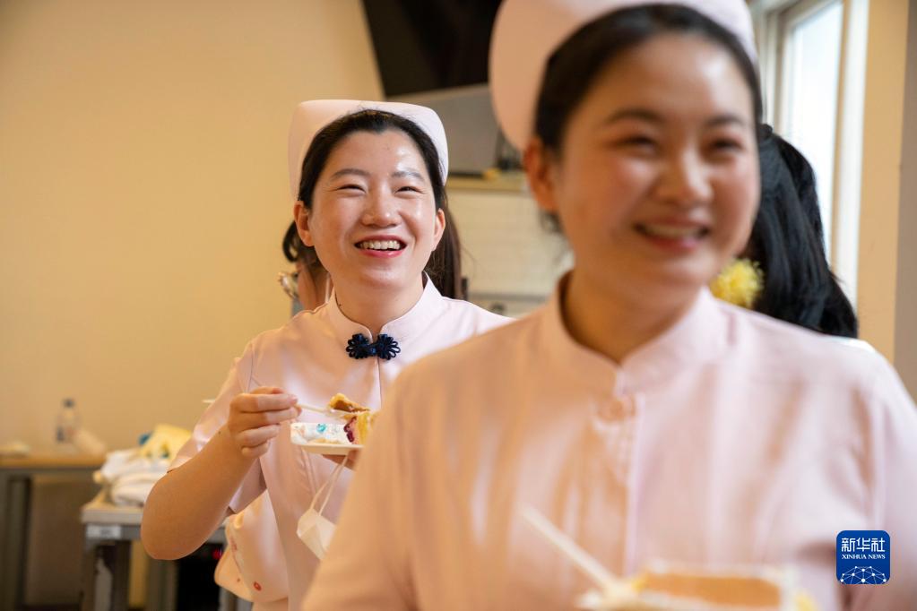 5月11日,在北京按摩醫(yī)院舉行的國際護(hù)士節(jié)慶祝活動上,醫(yī)護(hù)人員吃蛋糕。