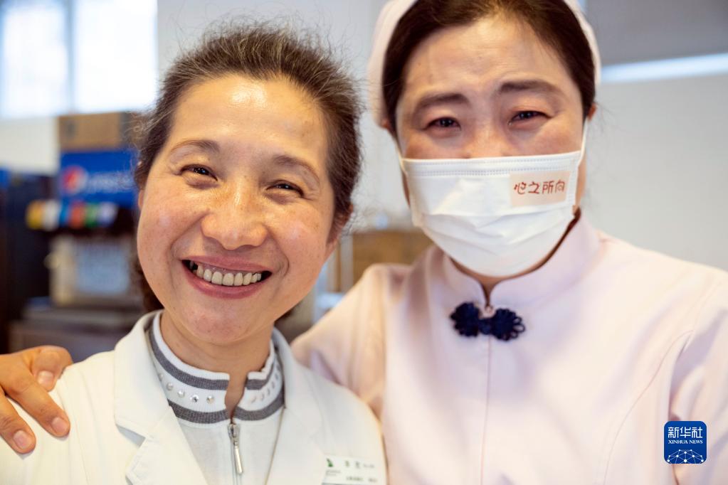 5月11日,在北京按摩醫(yī)院舉行的國際護(hù)士節(jié)慶?;顒由?,工作15年的護(hù)士鄭君霞(右)哭著與當(dāng)年剛工作就帶著自己的護(hù)士李欣老師合影留念。