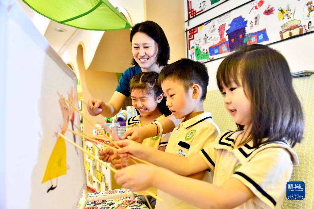 5月30日,在山東省實驗幼兒園,老師帶著孩子們體驗皮影戲。新華社記者 郭緒雷 攝