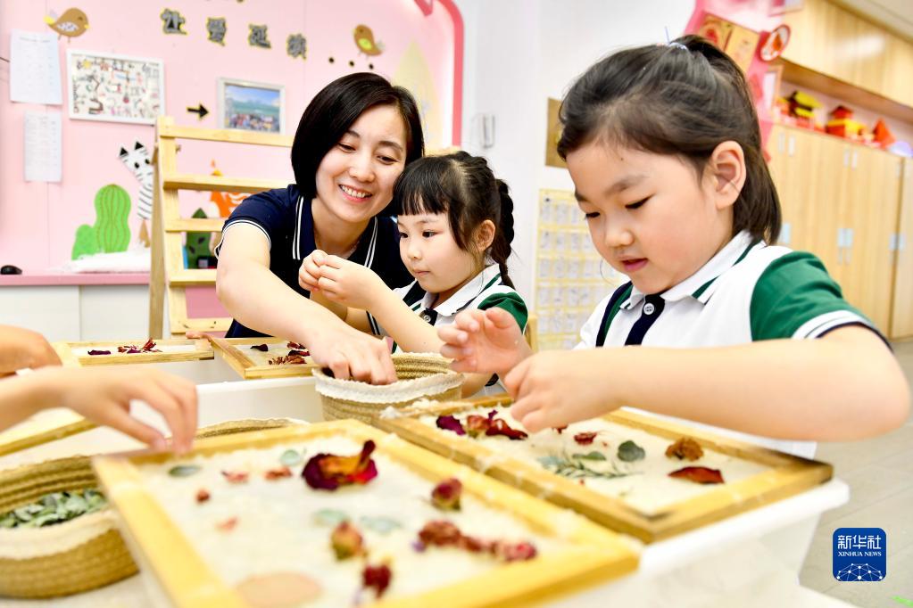 5月30日,在山東省實驗幼兒園,老師帶著孩子們體驗花草紙制作。新華社記者 郭緒雷 攝