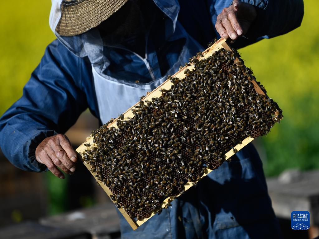 進(jìn)入七月,位于青海省海北藏族自治州門源回族自治縣的萬(wàn)畝油菜花競(jìng)相綻放。來(lái)自四川德陽(yáng)的蜂農(nóng)馮躍宣在花海里忙碌。他從早上7點(diǎn)開始整理蜂箱、采集花粉、晾曬花粉,一直忙碌到晚上8點(diǎn)。