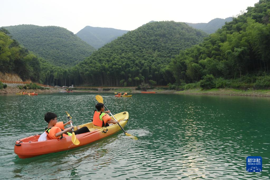 8月1日,小學(xué)生在位于紹興市富盛鎮(zhèn)的水上運動基地參加皮劃艇拓展活動。