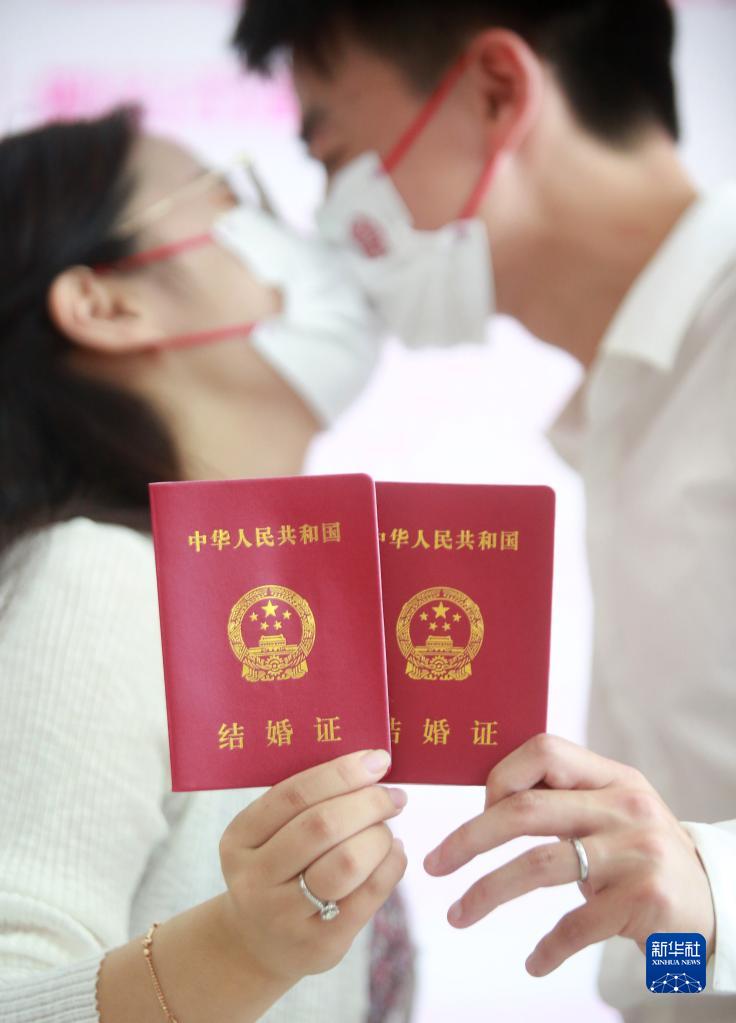 8月4日,在河北省石家莊市欒城區(qū)民政局婚姻登記處,一對新人領(lǐng)取結(jié)婚證后拍照留念。