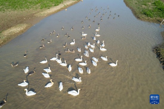 這是11月10日在湖南西洞庭湖濕地拍攝的小天鵝和灰雁(無人機照片)。