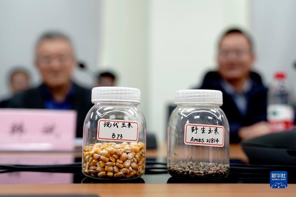 11月16日在中國科學院分子植物科學卓越創(chuàng)新中心拍攝的野生玉米種子和現(xiàn)代玉米種子。