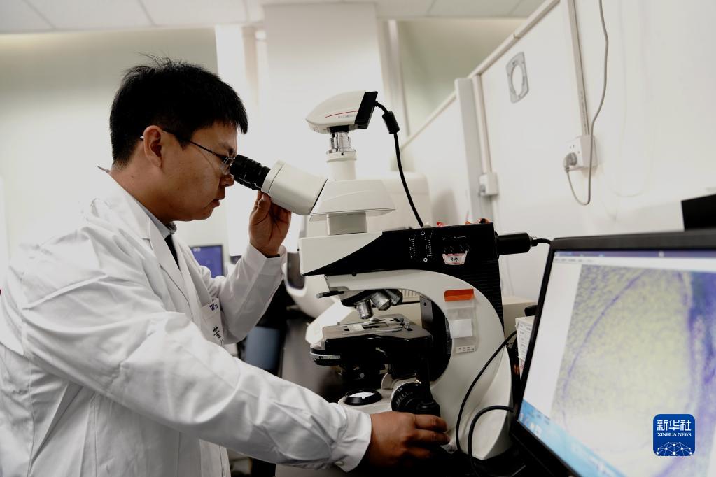 11月16日,中國科學院分子植物科學卓越創(chuàng)新中心博士后黃永財用顯微鏡觀察玉米胚乳細胞。