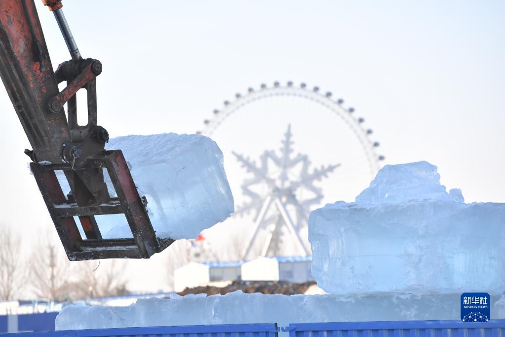 這是哈爾濱冰雪大世界4萬立方米存冰的取冰現(xiàn)場(11月26日攝)。