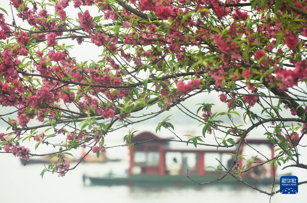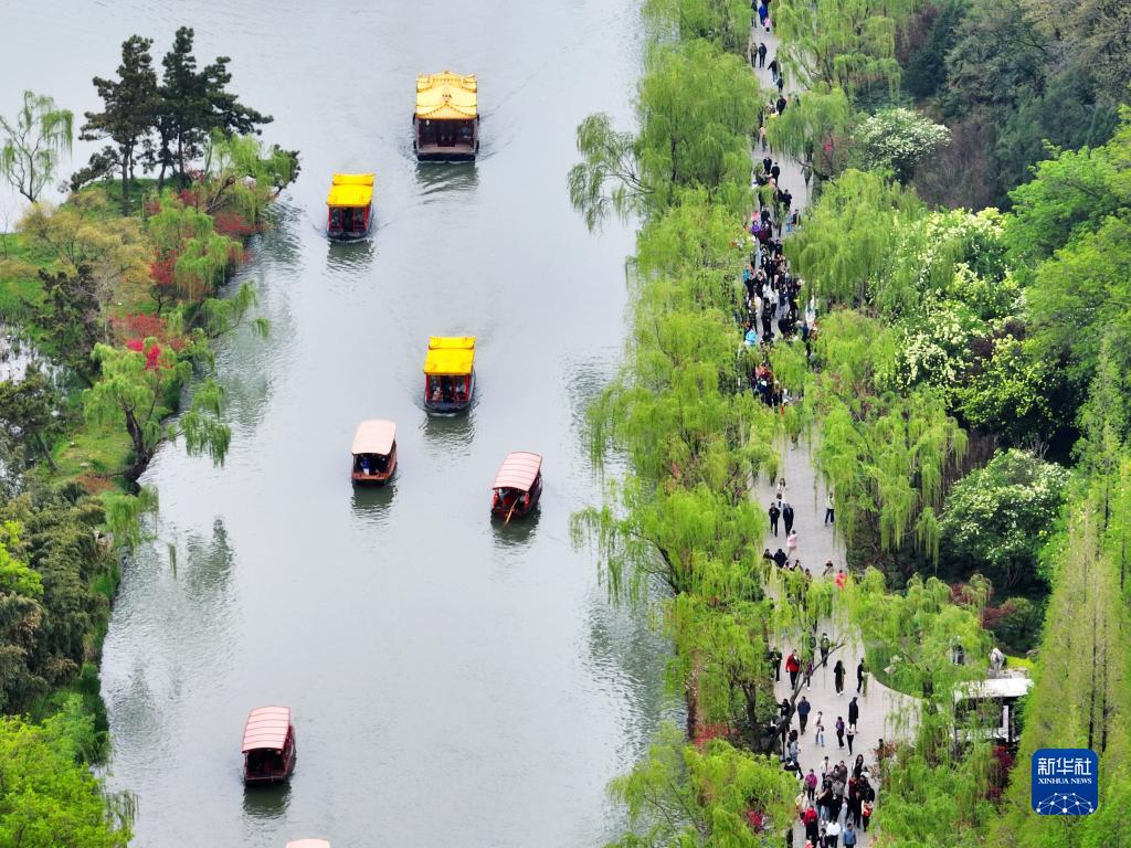 4月5日,游客在江蘇揚州瘦西湖風(fēng)景區(qū)游玩(無人機照片)。