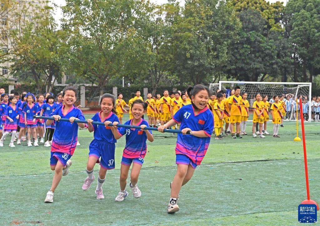4月17日,孩子們在廣西南寧市濱湖路小學(xué)進(jìn)行民族體育比賽。