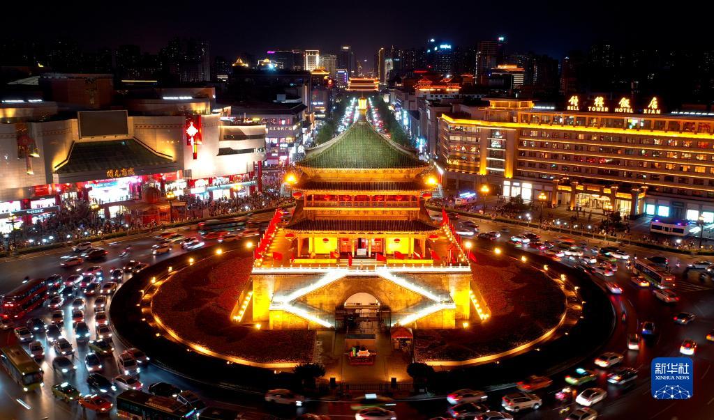 西安鐘樓夜景(5月2日攝,無(wú)人機(jī)照片)。