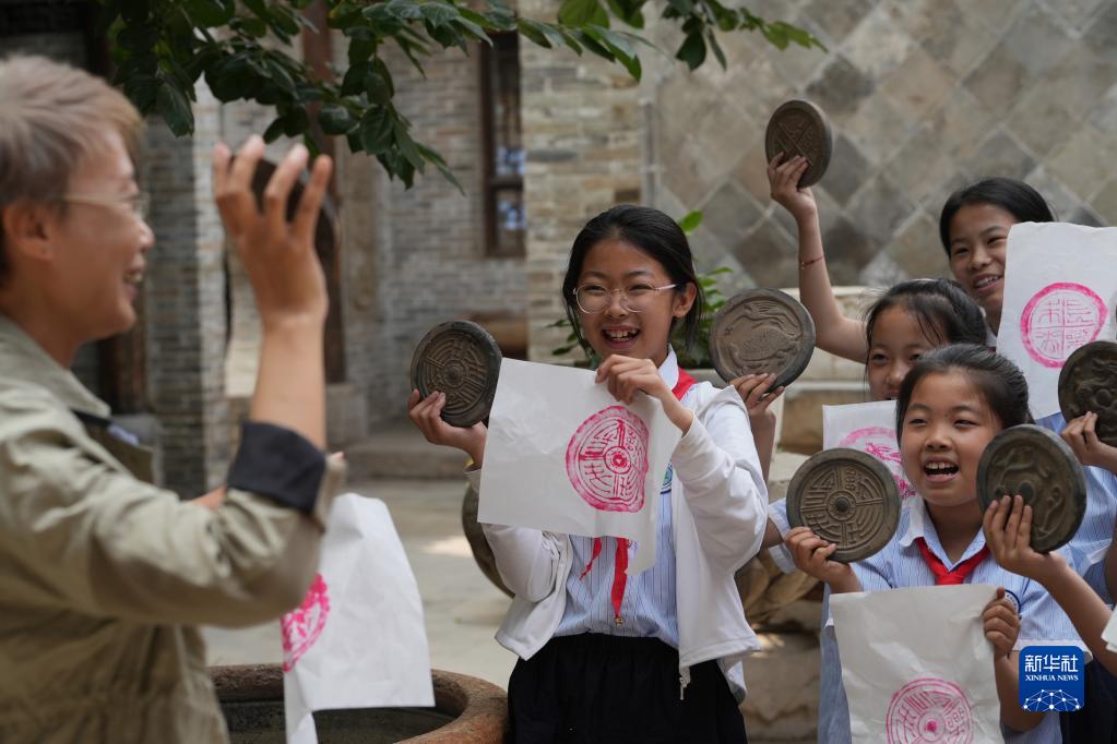 5月18日,小學(xué)生在河北省石家莊市新華區(qū)一家清代建筑博物館體驗瓦當拓片。