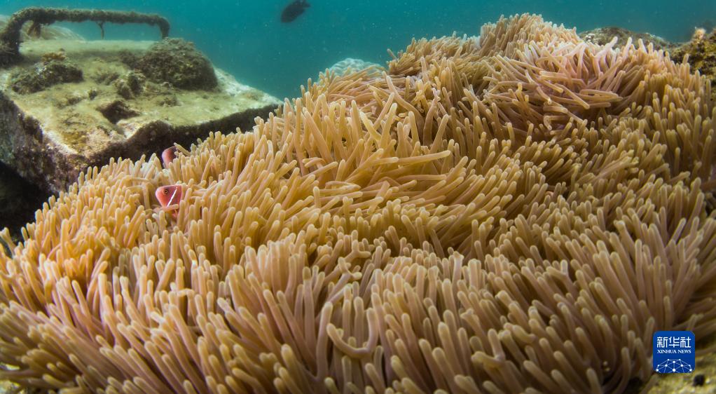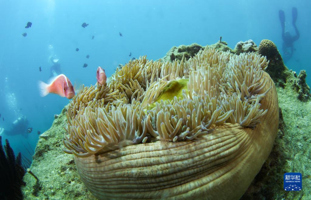 這是在蜈支洲島海域海洋牧場拍攝的小丑魚和海葵(5月18日攝)。