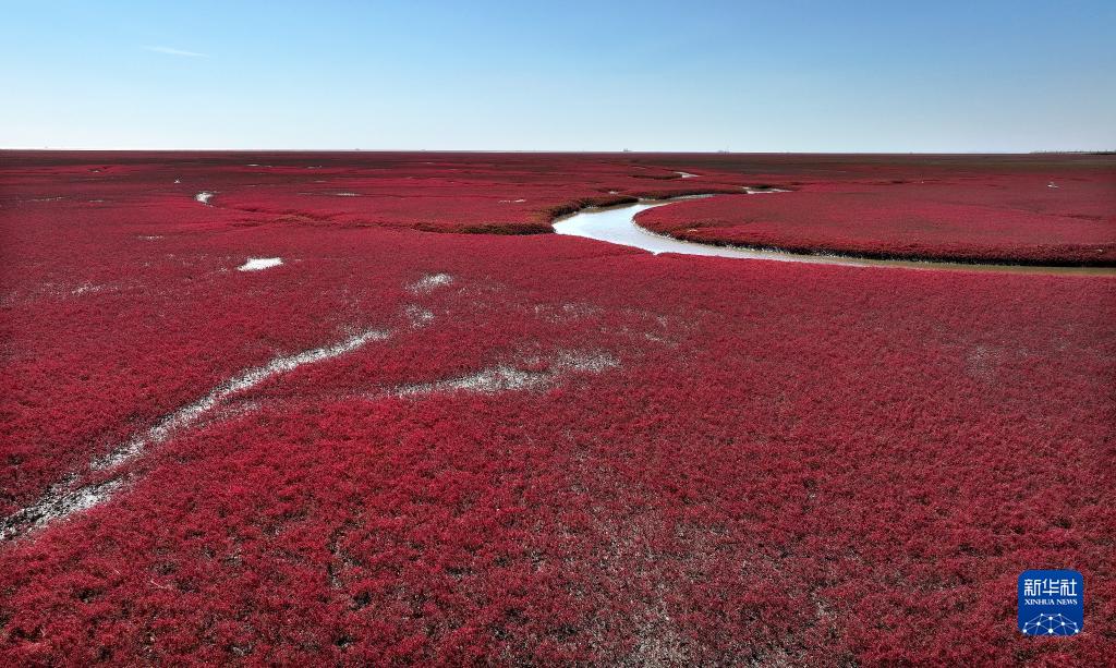 盤錦紅海灘國家風(fēng)景廊道景區(qū)內(nèi)的紅海灘(9月12日攝,無人機(jī)照片)。