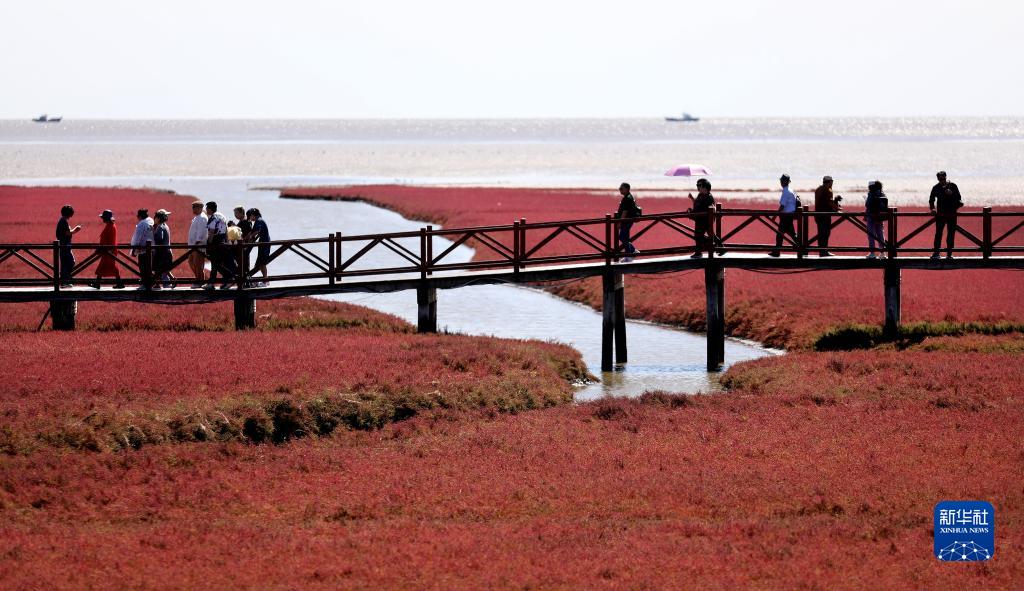 近日,遼寧省盤錦紅海灘國家風(fēng)景廊道內(nèi)的堿蓬草迎來最佳觀賞期,吸引了眾多游客前來觀賞游玩。