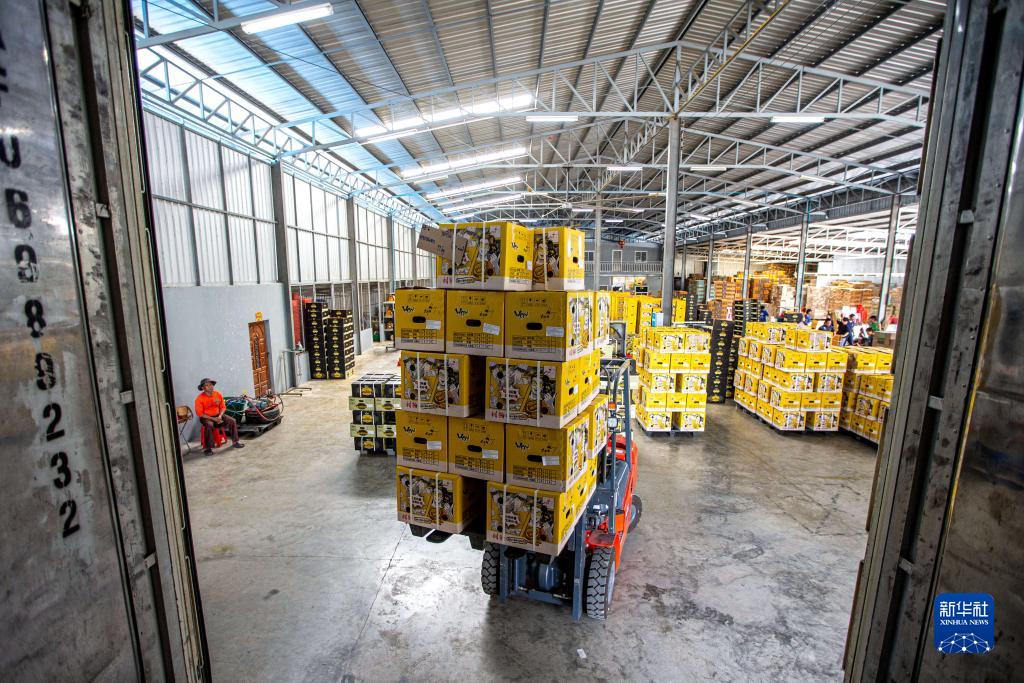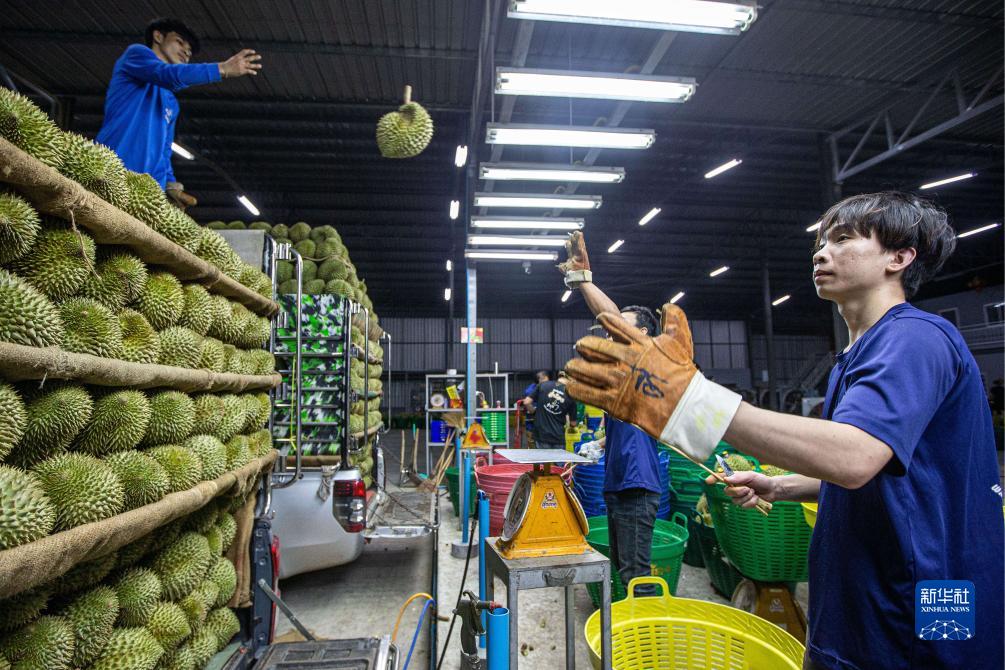 9月19日,在泰國春蓬府一家榴蓮工廠內(nèi),工作人員將包裝好的榴蓮裝車。