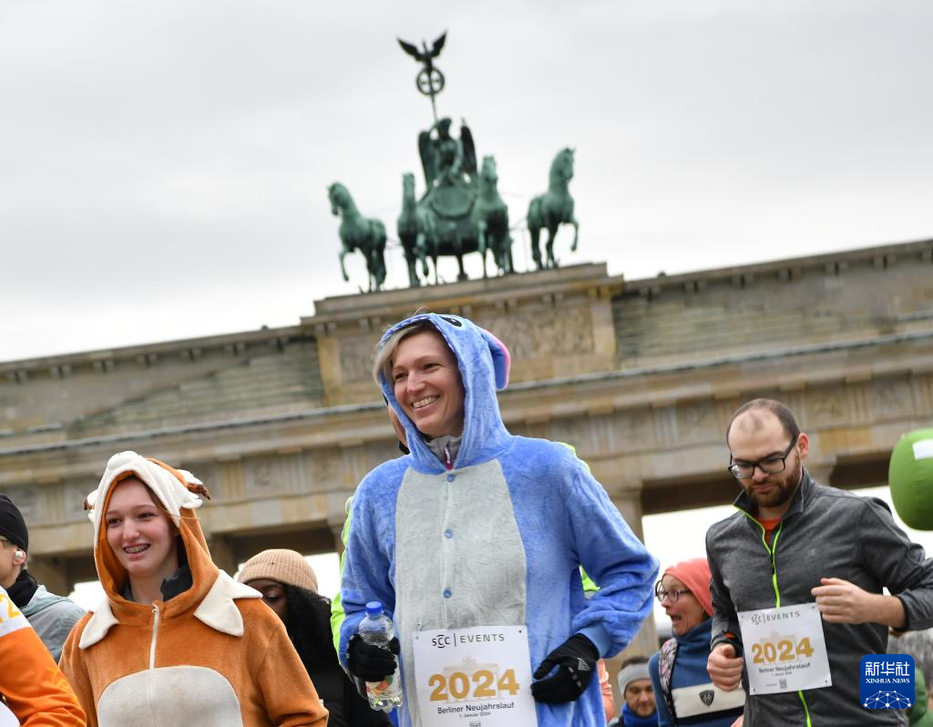 2024年1月1日,人們?cè)诘聡?guó)柏林勃蘭登堡門附近參加新年跑活動(dòng)。