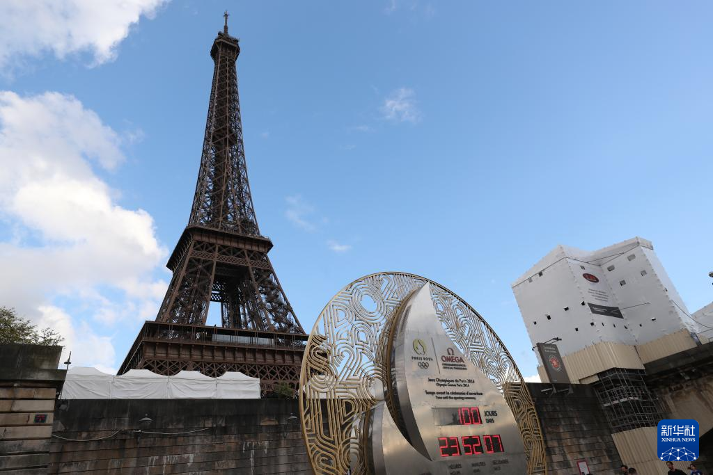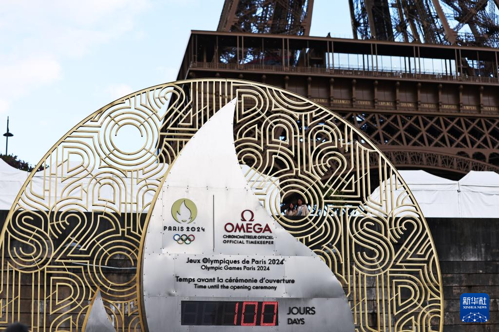 這是4月16日在法國巴黎埃菲爾鐵塔腳下拍攝的奧運會倒計時牌。