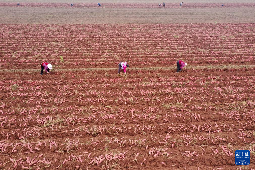 10月30日,在河南省沁陽市王曲鄉(xiāng)東王曲村一家庭農(nóng)場(chǎng),農(nóng)民在田間收獲紅薯(無人機(jī)照片)。
