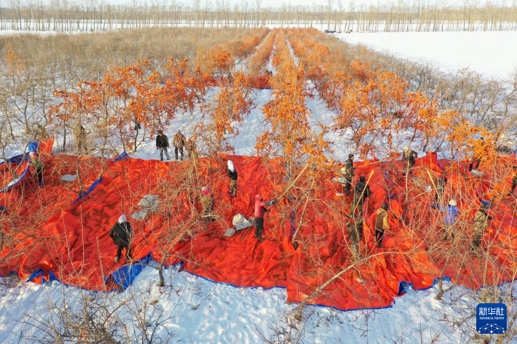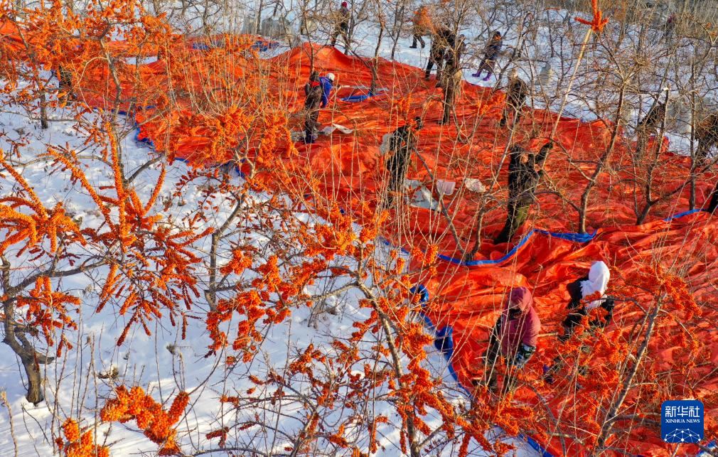 12月16日,黑龍江北大荒農(nóng)業(yè)股份有限公司友誼分公司的種植戶在采收沙棘果(無(wú)人機(jī)照片)。