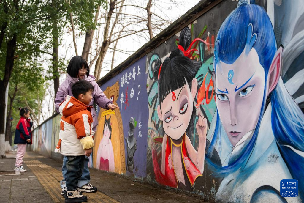 2月23日,市民在長沙市岳麓區(qū)岳麓街道五星村觀看哪吒主題墻繪。