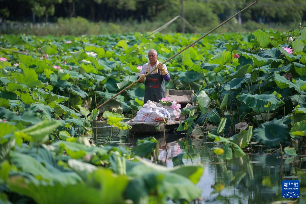 8月7日,農(nóng)民在浙江省湖州市吳興區(qū)埭溪鎮(zhèn)官澤村采摘荷花和蓮蓬。