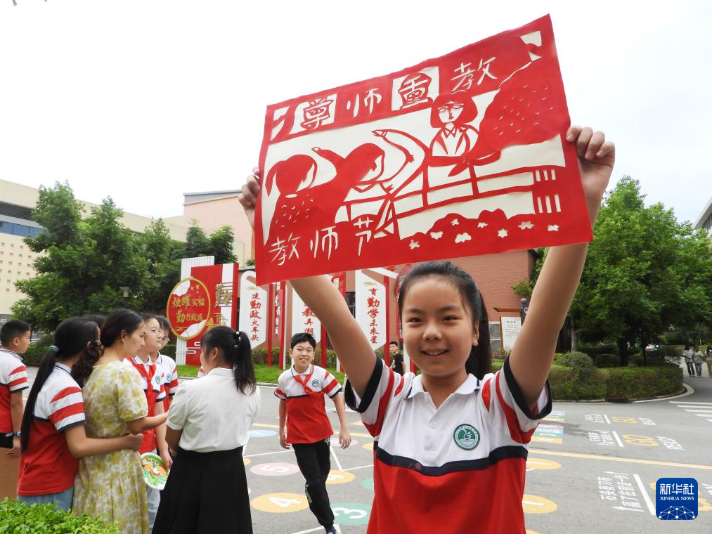 9月9日,四川達州高新區(qū)實驗學(xué)校學(xué)生展示獻給老師的創(chuàng)意剪紙作品。