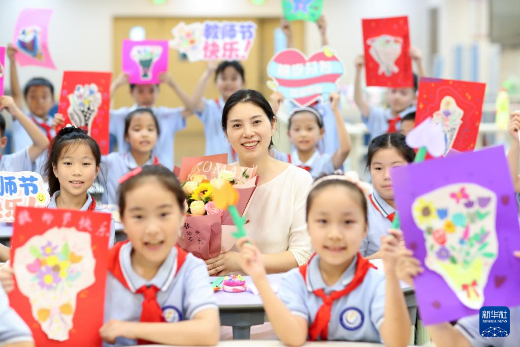 9月9日,在武漢市未來實驗小學(xué)美林校區(qū),學(xué)生為教師送上節(jié)日祝福。
