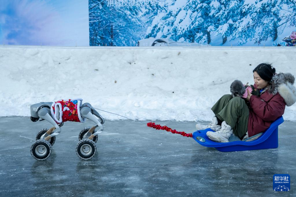 1月5日,游客在哈爾濱冰雪嘉年華園區(qū)乘坐機器人拉爬犁。